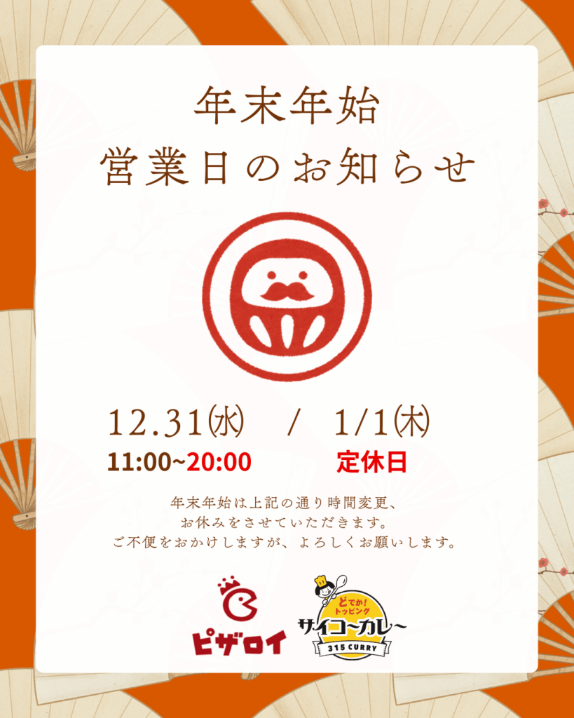 誠に勝手ながら、年末年始の営業は下記の通りとさせていただきます。
